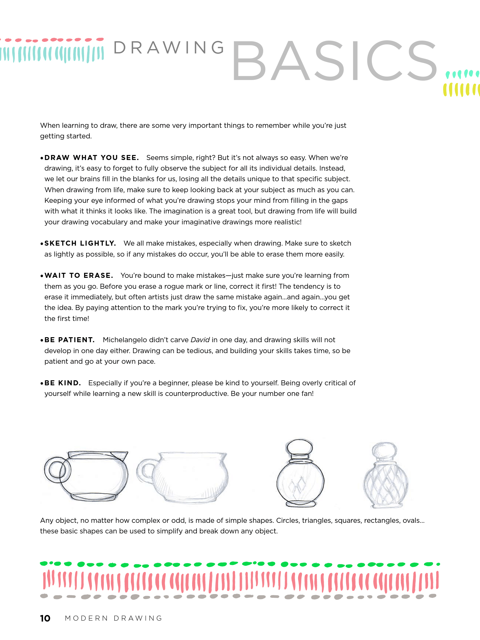 Modern Drawing shows artists, illustrators, art students, and art hobbyists how to use basic drawing principles and techniques to create fresh, expressive pieces of art. You’ll enjoy a dynamic, easy-to-follow exploration of drawing mediums and tools as you work through creative exercises and projects. Aspiring pencil artists and illustrators will also learn how to “see” a subject and render a personal yet modern interpretation of their observations on paper.